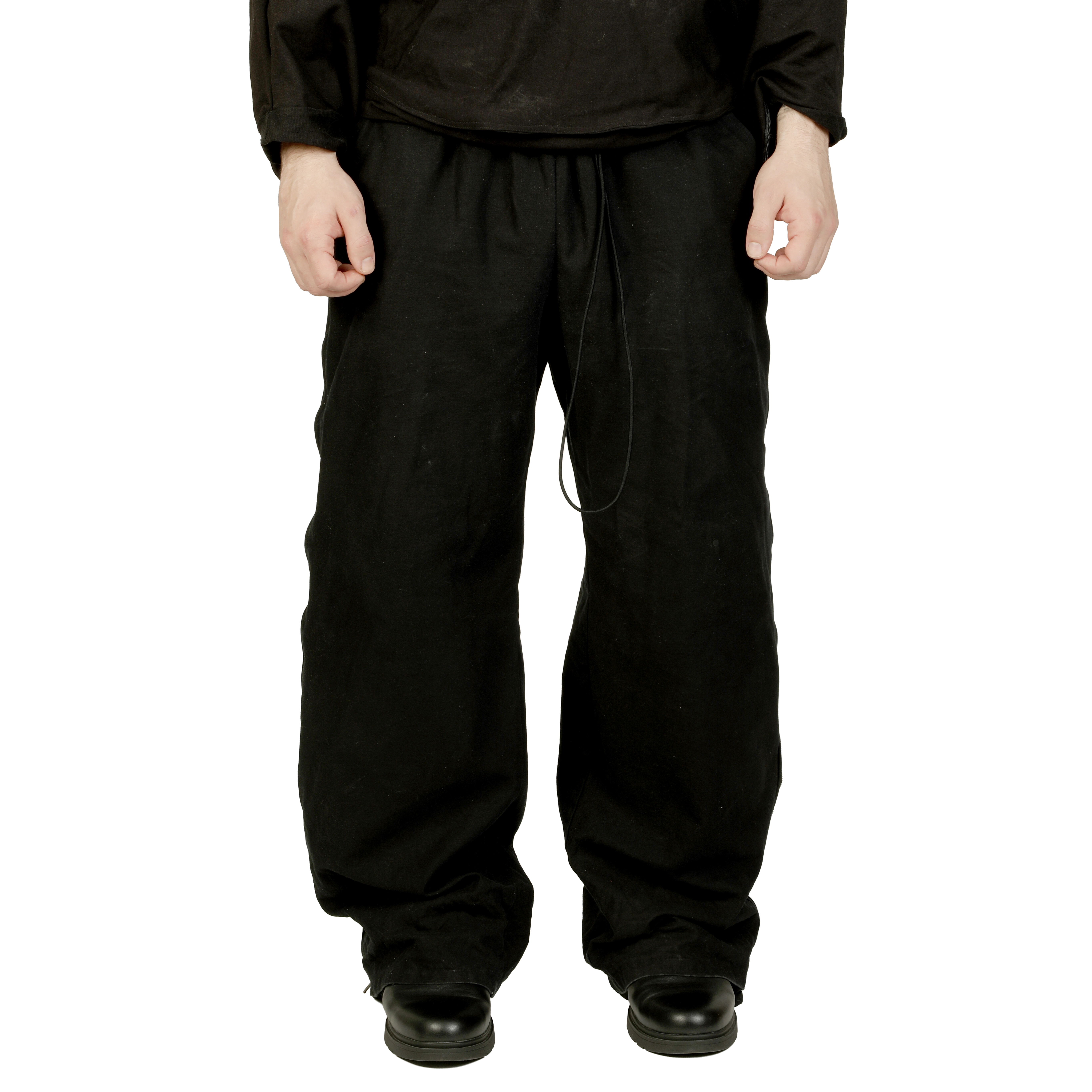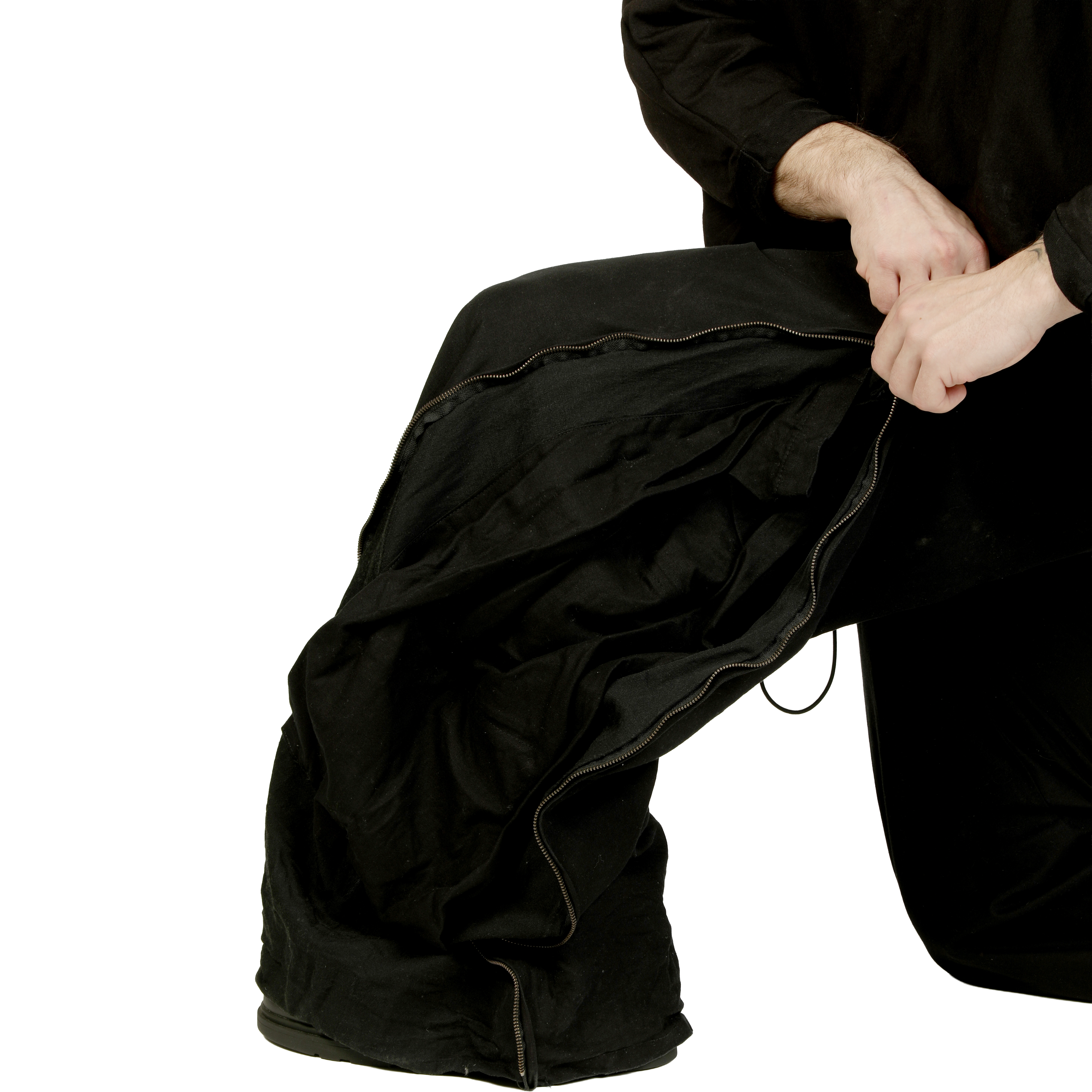 Crafted from heavyweight jersey cotton and reinforced with interfacing, Papilio features full-length butterfly pockets embedded along the inner legs. Opening the primary side-seam zip lets the internal panels flare outward, revealing secondary compartments accessed through brass YKK zips. The silhouette shifts from a clean wide leg to an expanded, multi-layered structure.